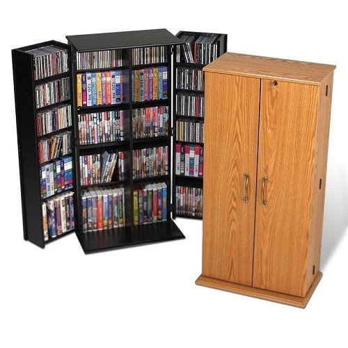 Keep your growing collection safe from prying eyes and sticky fingers with the Tall Locking Media Storage Cabinet. Fully adjustable shelves can be set to any position to accommodate your collection, and horizontal storage of media enables easy sorting, filing and re-filing of your collection as it grows. Off-set hinge points allow 180* movement for better display and access to door storage. Includes contemporary brushed nickel handles. Item can hold up to approximately 514 CDs or 320 DVDs or 190 videos or 118 Disney videos or any combination of the above. Also available in oak finish. Assembly Required.